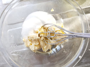 ![]() 1:耐熱ボールにマーガリンを入れてレンジで20秒ほど加熱して柔らかくし、グラニュー糖を加えて、白っぽくザラザラ感が消えるまですり混ぜます。 |
