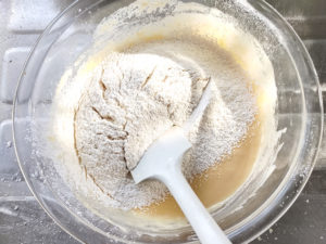 ![]() 5:薄力粉とベーキングパウダーの半量をボールに振るって加え、ゴムベラでさっくりと混ぜましょう。 ※粉が見えなくなるくらいまで。 |