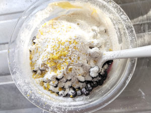 ![]() 6:水気を切ったブルーベリーとレモンの皮のすりおろしも加え、上にかぶせるようにして、残りの粉類を振るったら、練らないようにさっくりと混ぜます。 |