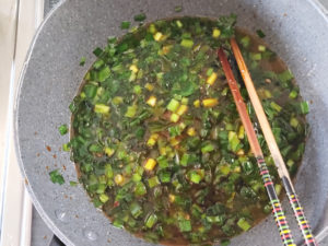 ![]() 3:フライパンに薄く油(分量外)を引いて、にらがしんなりするまで炒めましょう。 4:にらに火が通ったら、水と添付調味料を加えて、一旦煮立たせます。 |