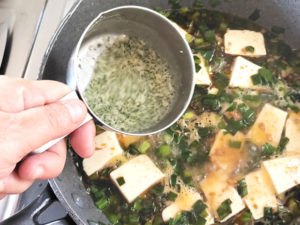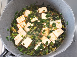 ![]() 6:フライパンに豆腐も加え、再度煮立たせます。 |