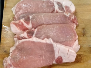 ![]() ①豚ロース切り身は、肉と脂に垂直に包丁を入れて、筋切りをしておきます。 |