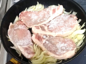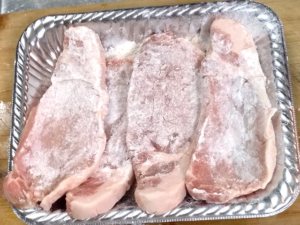 ![]() ②豚肉の全面に薄く薄力粉をまぶしましょう。 |