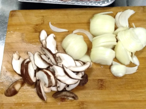 ![]() ③玉ねぎは皮をむいて薄切りに、椎茸は軸を取り、こちらも薄切りにします。 |