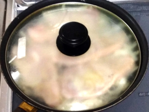蓋をして蒸し焼きにすることで、肉にもしっかりと火が通ります。