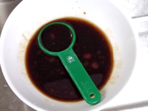 ![]() ⑦生姜、みりん、ウスターソース、ケチャップはあらかじめ混ぜ合わせておきましょう。 |