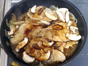 ![]() ⑧蓋を取り、椎茸、合わせ調味料を加えて、2分程炒め、全体に味が回ったらOKです。 |