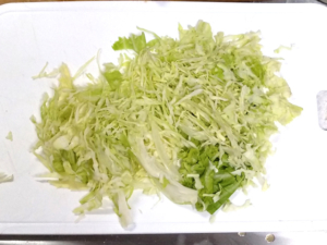 ![]() ⑨キャベツは千切りに、トマトは薄切りにします。 |