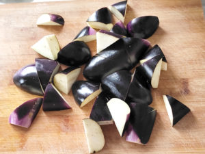 ![]() 1:ナスはヘタを取り、小さめの乱切りにします。 |
