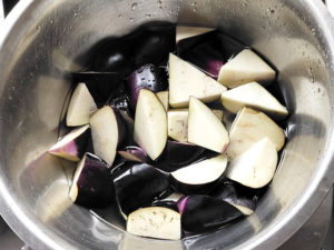 ![]() 2:切ったナスは水に5分ほど漬け込み、あくを抜きましょう。 3:晒したら、水気をしっかりとキッチンタオルなどでふき取ります。 |