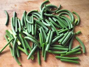 ![]() 4:ニンニクの芽は、食べやすい長さに切りましょう。 |