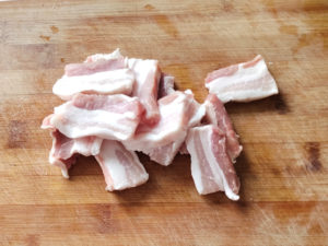 ![]() 6:豚バラ肉は、薄切りならそのまま5cm幅にカットし、ブロックの場合は8mm幅くらいにカットします。 |