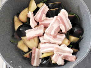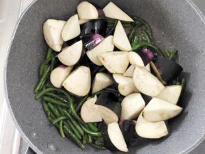 ![]() 7:フライパンにナスも投入し、残りの油を全て加えて、全体に油が回るまで炒めましょう。 |