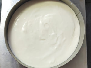 ![]() 12:サブレを敷いた上に、チーズ液をゆっくりと流し入れ、平らにならします。 13:冷蔵庫で1時間以上しっかりと冷やしましょう。 |