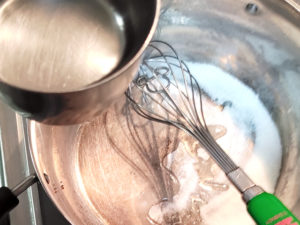 ![]() 14:アガーとアガー用砂糖を小鍋に入れ、泡立て器で混ぜ合わせます。 |