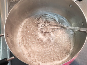 ![]() 16:鍋を火にかけ、混ぜながら沸騰させ、沸騰したら、弱火で1分弱火を通します。 |