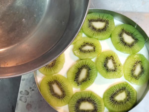 ![]() 18:冷蔵庫から型を取り出し、そっと触ってみて生地が固まっているようなら、上にカットしたキウイを並べます。 19:アガー液が触ってみて熱くならない程度まで冷めたら、型の上からゆっくりと注ぎましょう。 |