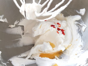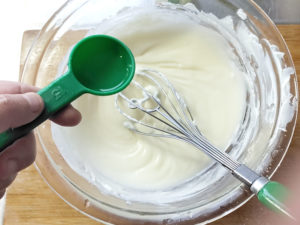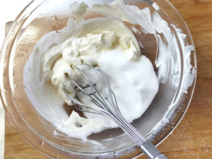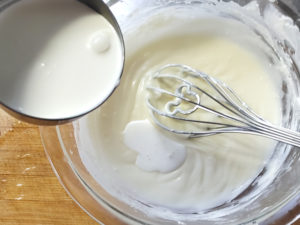 ![]() 10:チーズ用生クリームをボールに少しずつ加え、その都度よく混ぜます。 |
