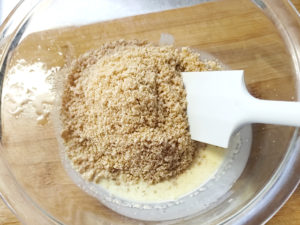 ![]() 4:耐熱ボールにマーガリンを入れて30秒ほど加熱し、マーガリンがしっかりと溶けたら、砕いたビスケットを加え、全体にマーガリンがいきわたるようにします。 |