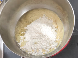 1:鍋に、弱火でマーガリンを溶かし、溶けたら薄力粉を加えて、練るようにしながら、ペースト状にします。