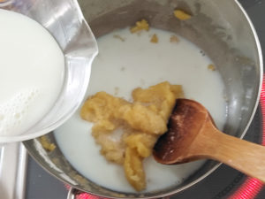 2:ペーストになったら、牛乳を100ccずつ加え、その都度滑らかになるまで混ぜ、ホワイトソースを作りましょう。