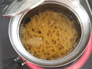3:別の鍋にお湯を沸かし、マカロニをパッケージの時間よりも5~6分長めにゆでます。