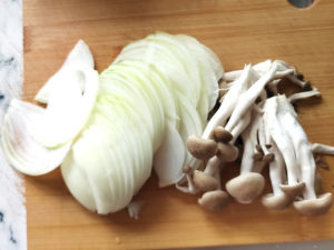 5:具材の玉ねぎは皮をむいて薄切りに、しめじは根元を落として小房に分けましょう。