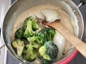6:ホワイトソースの鍋の中に、玉ねぎ、しめじ、冷凍ブロッコリーを入れて弱火にかけ、2分ほど焦げないように混ぜながら炒めます。