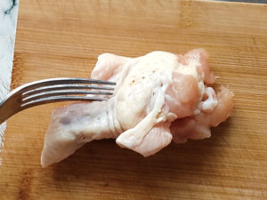 ![]() 1:手羽元は味がしみ込みやすいように、フォークで穴をあけておきます。 |