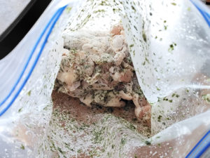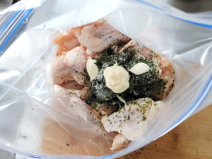 ![]() 2:ZIPロックの袋などに、手羽元、青のり、酒、塩、マヨネーズを入れて、袋の上からよくもみ込みましょう。 3:5~6分放置します。 |