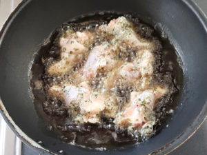 ![]() 6:サラダ油(分量外)をフライパンの高さ2~3cmまで入れ、180度くらいの中温で手羽元を揚げ始めましょう。 |