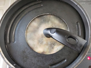 ![]() 7:蓋をして、片面3~4分くらいずつ、蒸し焼きにします。 ※蓋を開ける時には、水平にスライドさせて、油に水が入らないように注意してください。 |