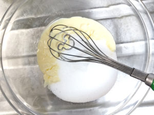 ![]() 2:耐熱ボールにマーガリンを入れて、レンジで20秒ほど加熱し、クリーム状にします。 3:グラニュー糖を加え、ザラザラ感がなくなり、白っぽくふわふわするまでしっかりと混ぜ合わましょう。 |