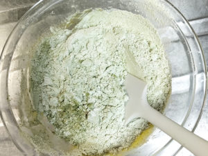 ![]() 6:薄力粉と抹茶を、一緒にふるい入れ、ゴムベラで練らないようにさっくりと混ぜます。 |