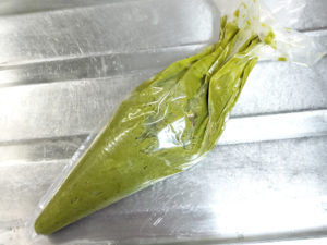 ![]() 7:生地に粉っぽさが無くなったら、絞り袋に詰め、袋の先を少し切って口金代わりにしましょう。 |