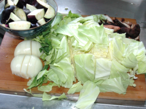 ![]() ③キャベツはざく切り、玉ねぎはくし形、椎茸は薄切り、茄子は輪切りにします。 ④茄子だけ油大1(分量外)をかけ、ラップをしてレンジで1分半加熱しておきましょう。 |