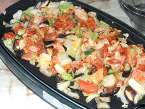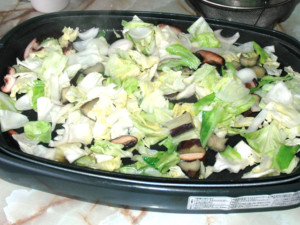 ![]() ⑤ホットプレートを温め、油(分量外)を引き、全ての野菜を入れたら、野菜がしんなりするまで炒めます。 |