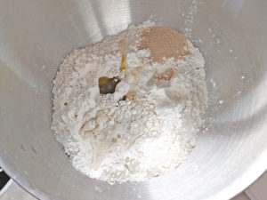 ![]() 1:スタンドミキサーに、強力粉、塩、ドライイースト(塩の反対側に)、生地用オリーブオイルを入れます。 |
