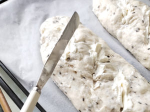 今回は柔らかめのクリームチーズだったので、生地に巻き込み、さらに切れ目に塗ってみました。