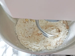 ![]() 2:スタンドミキサーにドゥーフックを装着して、水1/3量を入れて、低速で捏ねましょう。 3:捏ねている間に、水は全量入れます。 |
