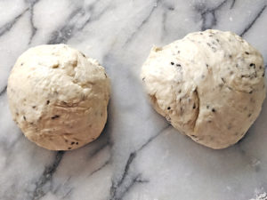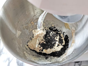 ![]() 4:生地が滑らかになったら、黒ゴマを加えて、フックが回らなくなるまで捏ねましょう。 |