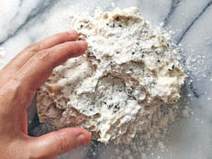 ![]() 9:生地を台に取り出し、再び打ち粉をして軽くまとめたら、スケッパーで2等分します。 |