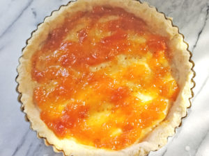 ![]() 13:冷めたタルト生地の上にアプリコットジャム(クリーム用)を乗せ、端の方まで塗り広げましょう。 |
