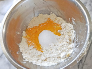![]() 1:大き目のボールに、中力粉とタルト生地のマーガリンを加え(直前まで冷蔵庫に)、カードなどでマーガリンを細かく切り崩します。 |