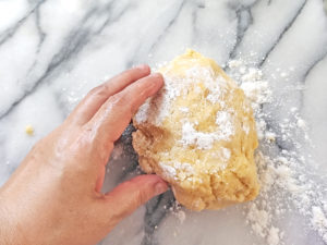 ![]() 3:台の上に生地を取り出し、強力粉少々(分量外)を台の下と生地の上にかけて、手で生地を軽くまとめます。 |