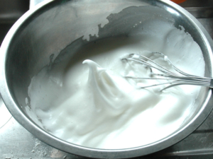 ![]() ①卵黄と卵白を別々のボールに入れ、卵白に砂糖を一つまみ加えて泡立て始め、途中二回に分けて砂糖を加え、ピンと角が立つまで泡だててメレンゲを作ります。 |