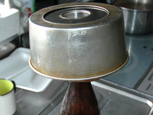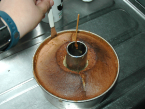 ![]() ⑪ケーキが焼けたら、すぐに逆さにして、瓶などに挿し、このまま2時間以上放置します。 |