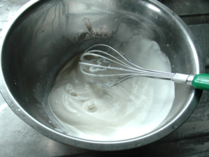 ![]() ⑫★デコレーション用のクリームと砂糖を泡立て、7分立てくらいのやや柔らかいクリームを作ります。 |