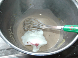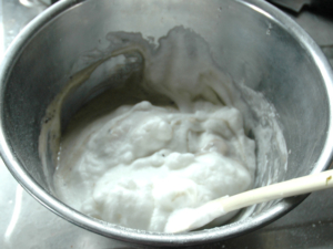 ![]() ④ブルーベリーをミキサーで液体状にしたものを少しずつ加え、その都度良く混ぜます。 |