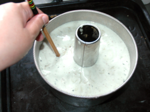 ![]() ⑧型に生地を流しいれ、筒部分を押さえて、二回ほどトントン落として空気を抜きます。 ⑨箸をケーキ内で、くるくる回しながら一周させ、中の気泡も取り除きましょう。 |